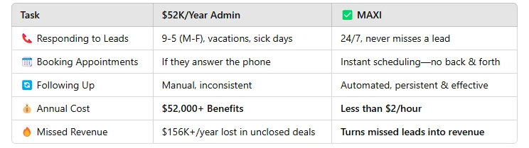 Never Takes a Break – While your $52K/year admin clocks out, MAXI keeps working—24/7.